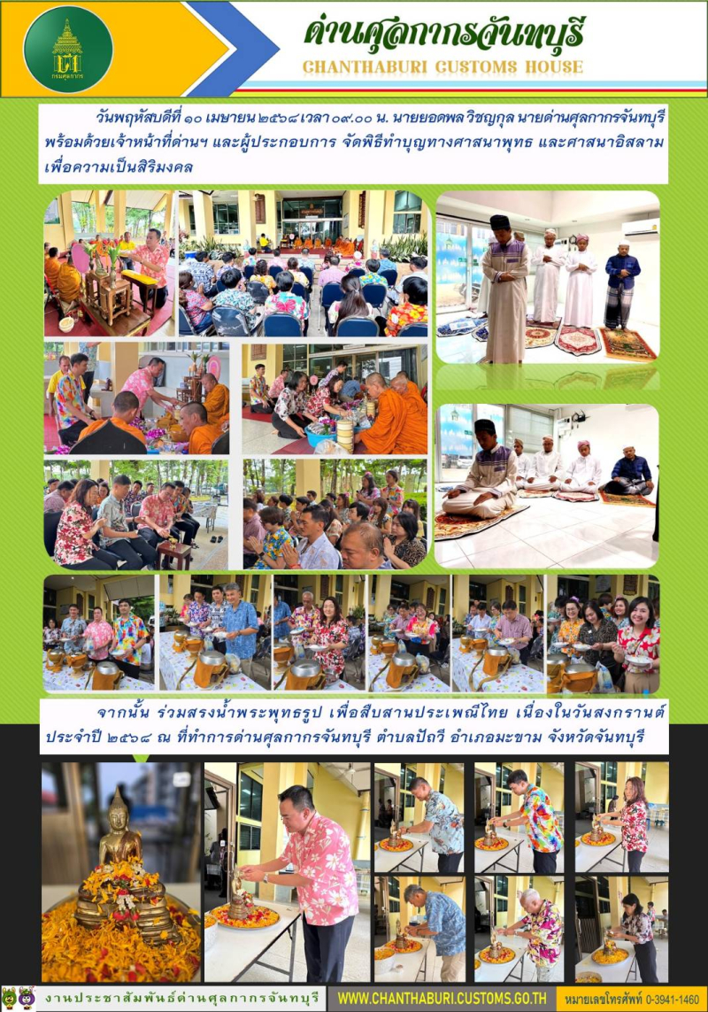 ด่านศุลกากรจันทบุรี พร้อมด้วยเจ้าหน้าที่ด่านฯ และผู้ประกอบการ จัดพิธีทำบุญทางศาสนาพุทธ และศาสนาอิสลามเพื่อความเป็นสิริมงคล