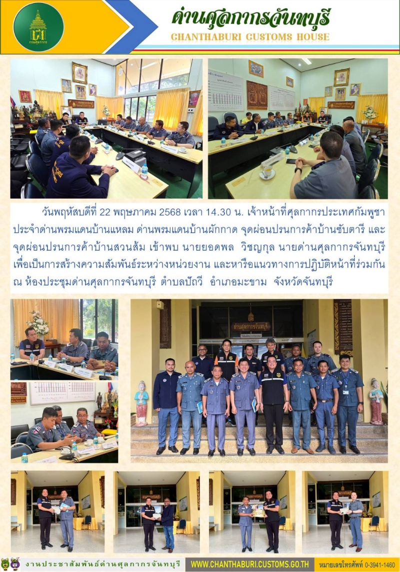 ด่านศุลกากรจันทบุรี ร่วมหารือแนวทางการปฏิบัติหน้าที่ร่วมกัน โดยร่วมกับเจ้าหน้าที่ศุลกากรประเทศกัมพูชาประจำด่านบ้านแหลม ด่านพรมแดนบ้านผักกาด จุดผ่อนปรนการค้าบ้านซัพตารี