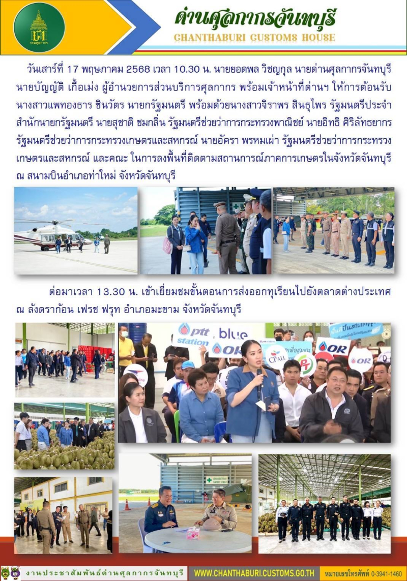 ด่านศุลกากรจันทบุรี ร่วมต้อนรับ นางสาวแพทองธาร ชินวัตร (นายกรัฐมนตรี) ในการลงพื้นที่ติดตามสถานการณ์ภาคเกษตรในจังหวัดจันทบุรี