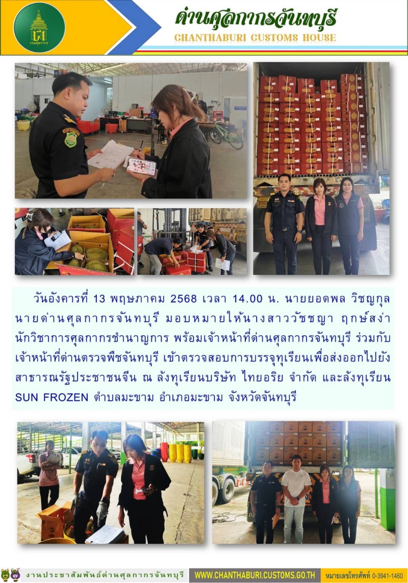 ด่านศุลกากรจันทบุรี ร่วมกับด่านตรวจพืชจันทบุรี เข้าตรวจสอบการบรรจุทุเรียนเพื่อส่งออกไปยังสาธารณรัฐประชาชนจีน