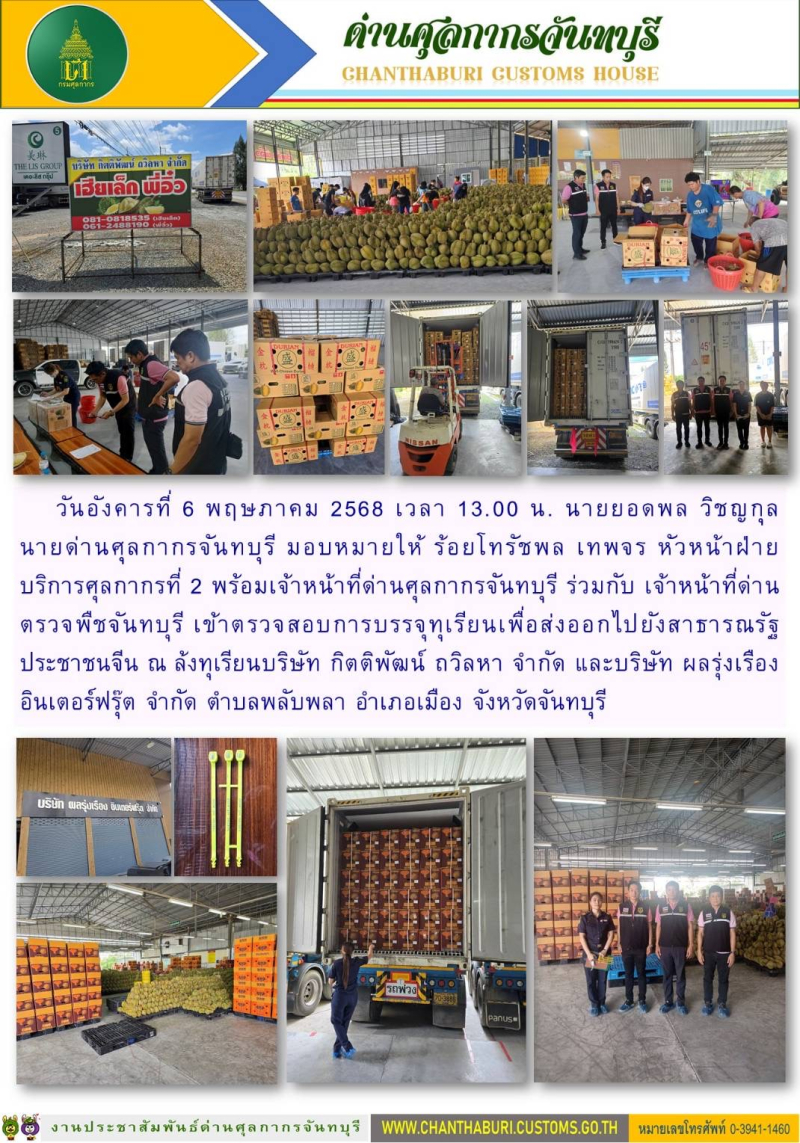ด่านศุลกากรจันทบุรี พร้อมกับด่านตรวจพืชจันทบุรี เข้าตรวจสอบการบรรจุทุเรียนเพื่อส่งออกไปยังสาธารณรัฐประชาชนจีน ณ ล้งทุเรียนบริษัท กิตติพัฒน์ ถวิลหา จำกัด และบริษัท ผลรุ่งเรืองอินเตอร์ฟรุ๊ต จำกัด