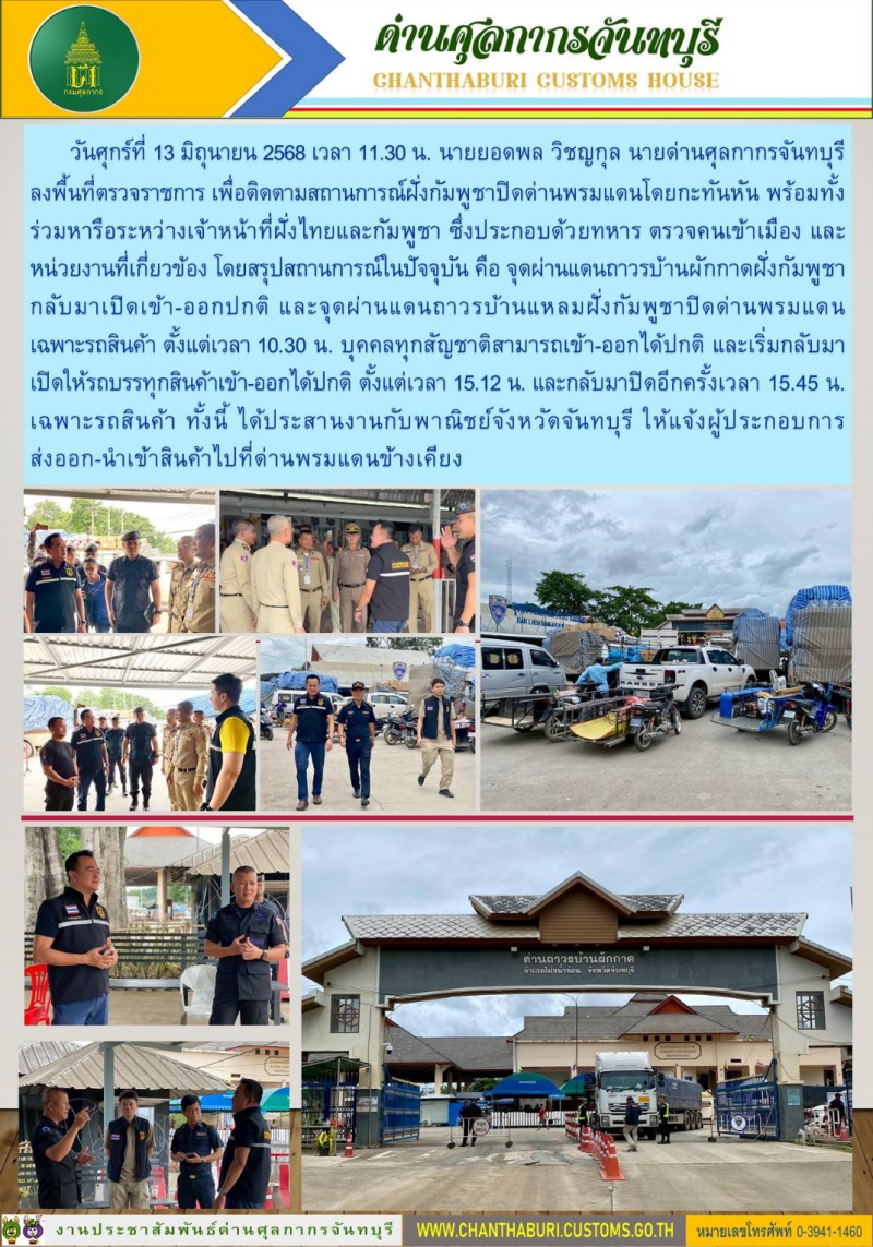 ด่านศุลกากรจันทบุรี ลงพื้นที่ตรวจราชการเพื่อติดตามสถานการณ์ฝั่งกัมพูชาปิดด่านพรมแดนโดยกระทันหัน