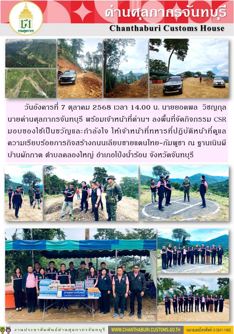 ด่านศุลกากรจันทบุรี ลงพื้นที่จัดกิจกรรม CSR มอบของใช้เป็นขวัญและกำลังใจ ให้เจ้าหน้าที่ทหารที่ปฏิบัติหน้าที่ดูแลความเรียบร้อยภารกิจสร้างถนนเลียบชายแดนไทย-กัมพูชา