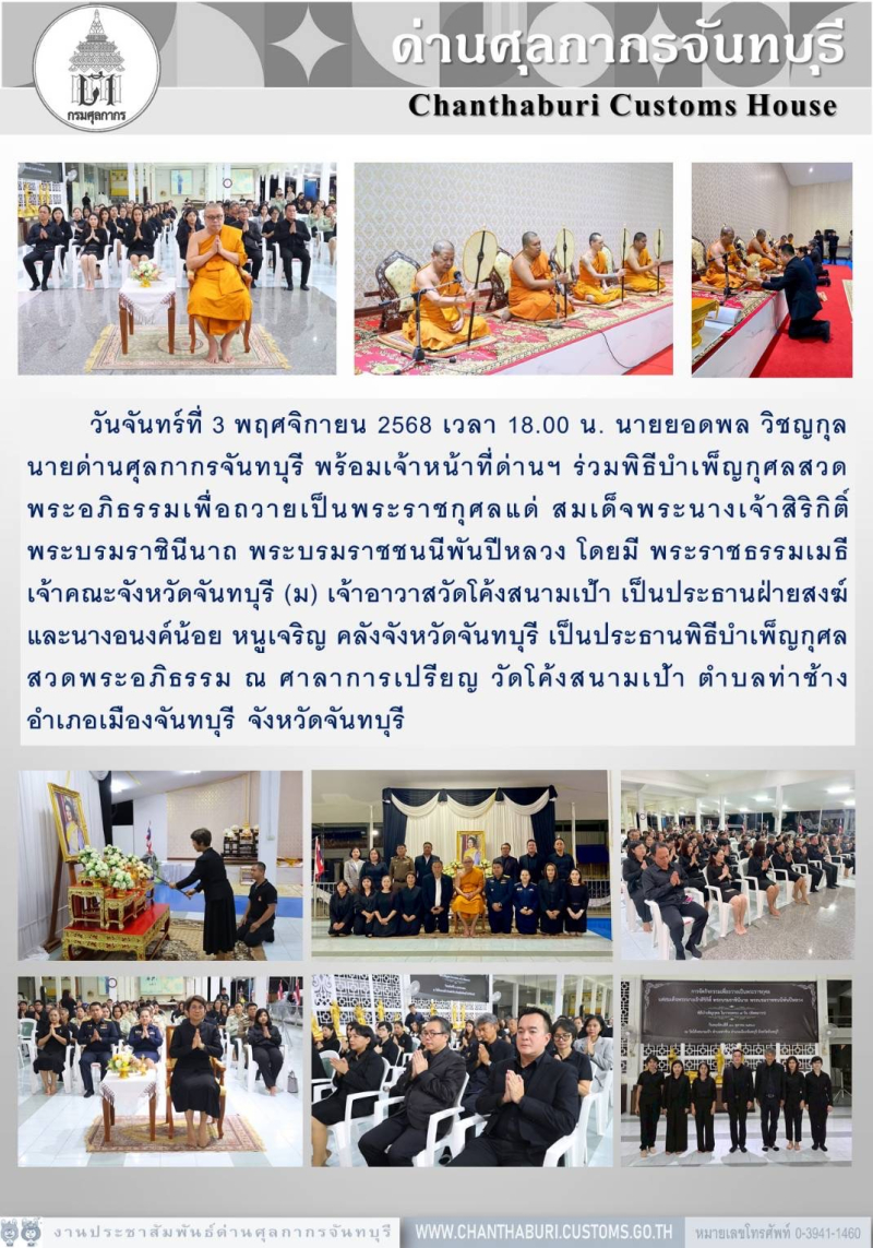 นายด่านศุลกากรจันทบุรี ร่วมพิธีบำเพ็ญกุศลสวดพระอภิธรรมเพื่อถวายเป็นพระราชกุศลแด่ สมเด็จพระนางเจ้าสิริกิติ์ พระบรมราชินีนาถ พระบรมราชชนนีพันปีหลวง